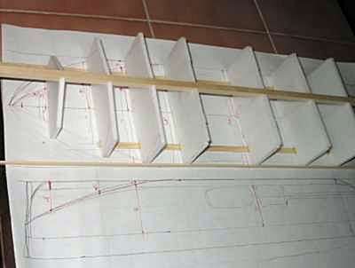 zbytek smrkové lišty 2x5mm. Purexem jsem žebra nalepil na kýl a k nim přilepil