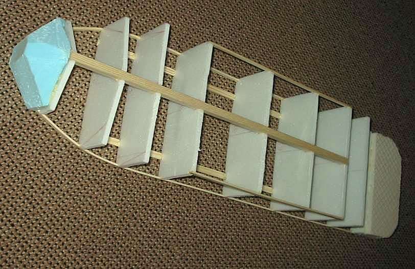 dobře by ale poslouží i obyčejný polystyrén) a vybrousil z nich konečný tvar přídě