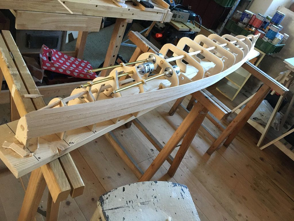 Samotná stavba již probíhá klasicky: překreslit žebra na překližky tl. 8 mm, svrtat otvory pro nosné kulatiny a celou kostru umístit na pracovní desku – v mém případě spíš pracovní fošnu. Následně došlo k umístění hřídelí a motoru. V modelu jsou tři kusy MIG 500 Turbo 12V na hřídelích MP JET s přírubou – dle mého nejjednodušší a nejspolehlivější řešení. Asi nejoblíbenější část stavby následuje– oplaňkování balsou tl. 4 mm, po kterém loď konečně dostane tvar. Posléze nahrubo zatmeleno, obroušeno a přes balzu dvě vrstvy lamina. Pak přichází naopak nejneoblíbenější část – tmelení a broušení.