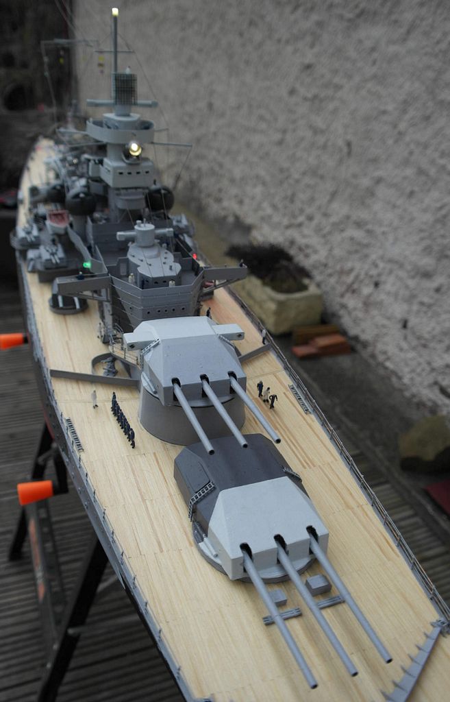 Když bylo potvrzeno, že loď plave a pluje, pustil jsem se do vrtání a osazování okének (cca 170x na každé straně) dále nahrubo připravená paluba a začátek formování nástaveb. Od začátku bylo jasné, že se věže budou otáčet – proto je pod každou věží umístěno servo s rozšířeným úhlem otáčení na 270° a zpomalovačem.
