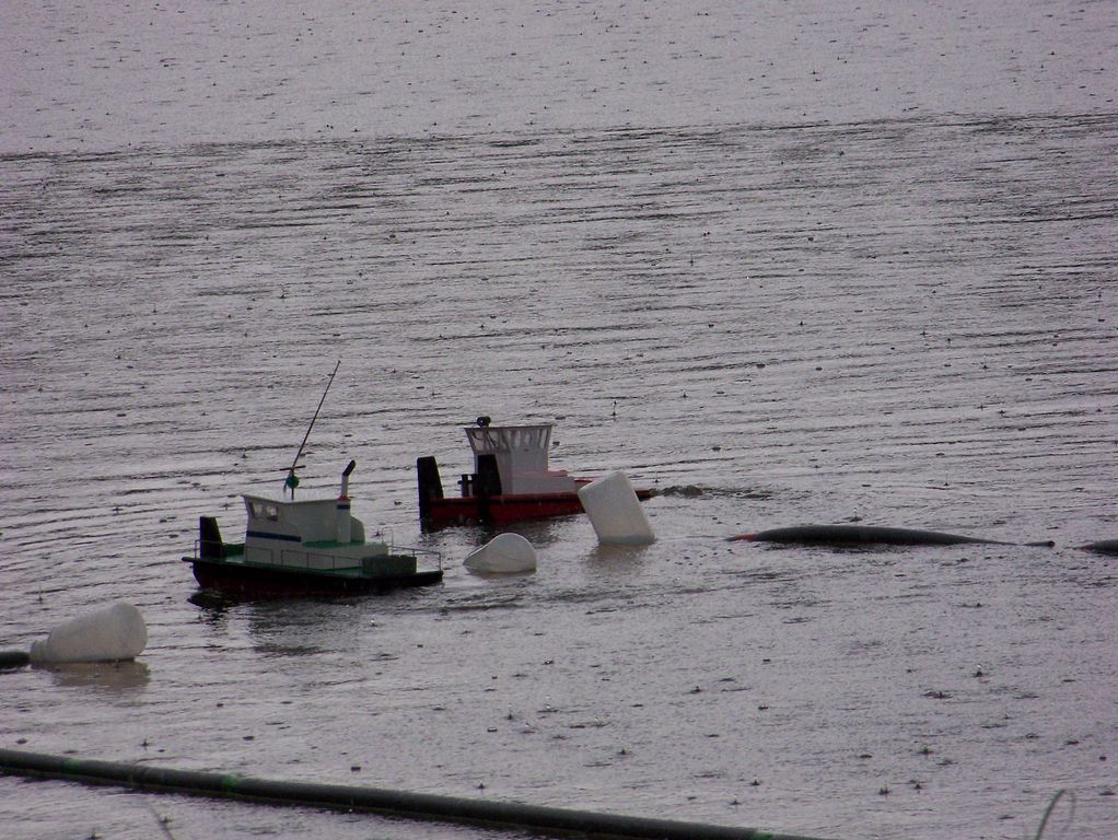 Po krátké soutěži parníků došlo na volné jízdy ostatních modelů, jelikož ještě nebyla postavená trať pro další soutěže. Než se tak stalo, tak se pomalu rozpršelo, zatím jenom drobně. Na vodě bylo pár bójek pro plachetnice a hřiště pro vodní pólo se Springery. Ty se sešly jenom dva, takže bylo dělení na týmy celkem jednoduché. Brzy po startu se ukázalo, že koncepce zvolených mantinelů nebyla právě ideální, jelikož míč v podobě jedné neukotvené bójky často mantinel přeskakoval, když se o něj strhl boj. Můj Springer se často zadním úvazem dostal pod mantinel z PUR izolace na trubky. Sice se vždy vyprostil sám, ale zbytečně ztrácel čas. Jako další slabina se ukázalo, že v rozích byla škvíra a míč občas vyplaval i tudy. Na druhou stranu pokud by tam díra nebyla, tak by se ho asi nedařilo dostat od mantinelu.