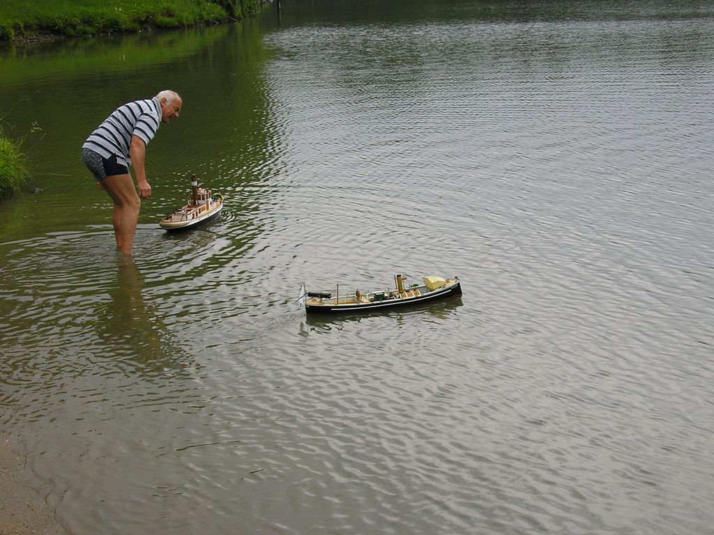Jakmile bylo po vodním pólu, tak najednou vysvitlo slunce. Převážná většina přítomných se dala rychle na ústup a u vody zůstalo jen pár nadšenců. Došlo na tahání kanoe, kterou tahal remorkér Hanibal od Ivana Červeného, a vzadu jsem se pokoušel parazitovat se svým Springerem. Ten se však měnil v ponorku, tak jsme toho brzo nechali. Pak ještě Ivan chvilku vozil jakéhosi chlapce, ale brzy se vybil akumulátor, jak remorkér jezdil už dříve celé odpoledne.