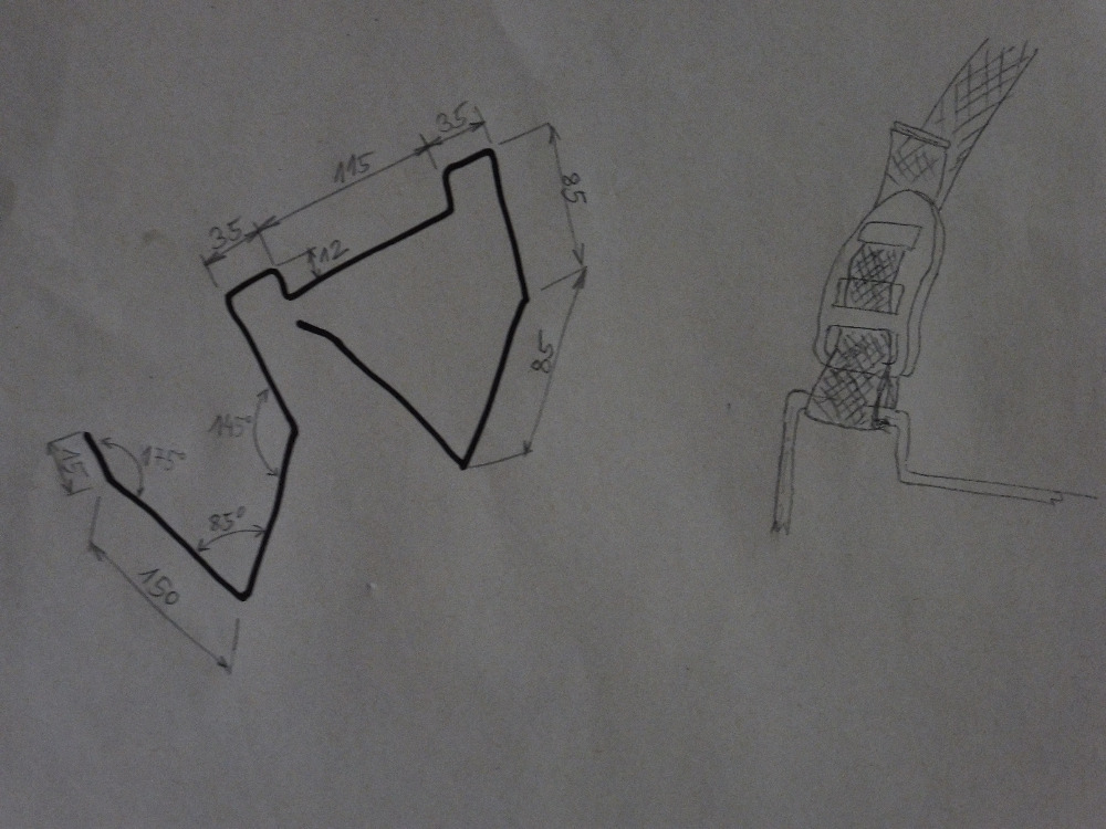 K zavěšení pultu postačí ocelový svařovací drát průměru 3 mm, ideálně poměděný, v délce 1 m, tedy běžný. Na koncích drátu srazíme hrany dokulata pilníkem nebo na brusce. Ve svěráku mezi tvrdým dřevem obloženými čelistmi (hezky česky „paknami”) po definitivním rozvržení pultu naohýbáme tlakem dlaně cca podle náčrtku, pomůžeme si dřevěnou paličkou. Jeden metr svářecího drátu vyšel na délku akorát, začneme tedy od označené (třeba fixem) poloviny oběma polooky pro upevnění popruhu (podle jeho šířky!) a pokračujeme dalšími ohyby. Pokud je drát poměděný, pokusíme se ho nepoškrábat. Rozměry a úhly jsou jen orientační. Konce v délce asi 15 mm nyní už hotového závěsu mírně vyhneme asi o 5° tak, aby šly do komůrek základní desky zasunout ztuha. Konečná úprava závěsu bude po odmaštění nitroředidlem nátěr bezbarvým lakem (nebo podle vkusu) kouskem molitanu.