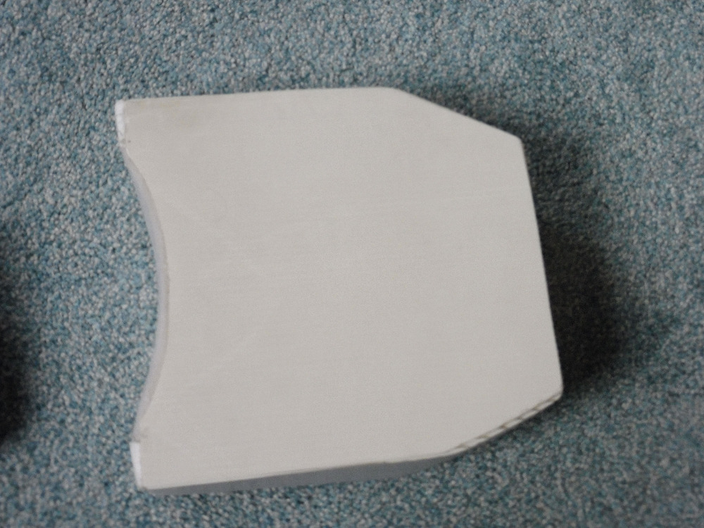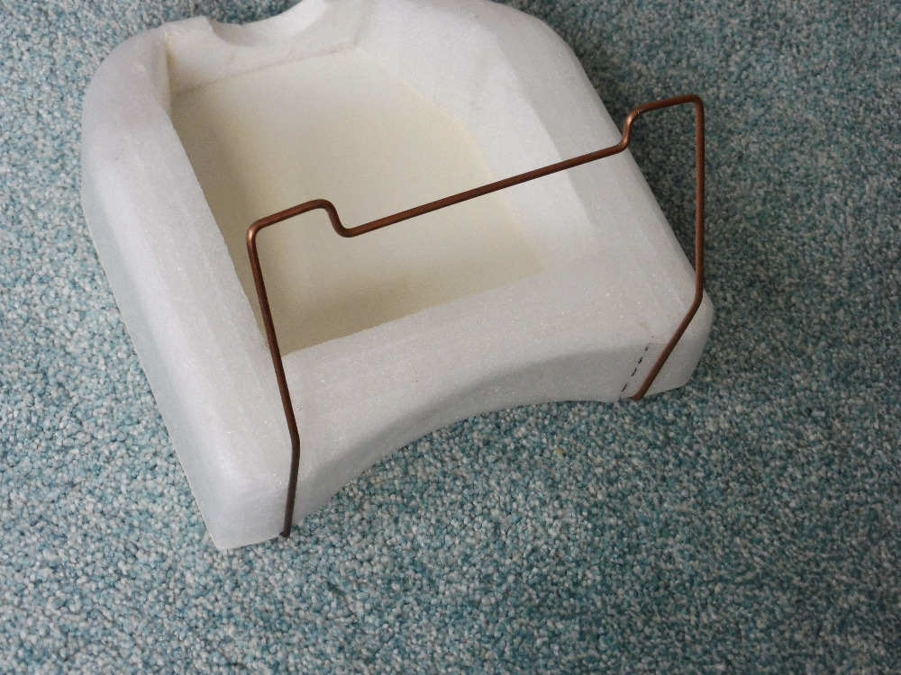 Po vychladnutí vysílač zatlačíme k zadní stěně, a vyřešíme přední stěnu, podle tvaru vysílače, nebo madla, což se zpravidla liší typ od typu i jednoho výrobce. Ideální řešení bude opět na zamáčknutí do pultu. Po definitivním usazení vysílače, nyní mezi čtyřmi hranoly, přilepenými na základní desku, bude následovat ořezání do požadovaného tvaru cca podle výšky tělesa vysílače, s přídavkem asi 3 mm na vyžehlení. Na ořez se hodí dlouhý odlamovaní (nová čepel) nebo i kuchyňský dlouhý ale ostrý nůž. Řežeme pomalu a opatrně za stálé kontroly dosaženého tvaru.