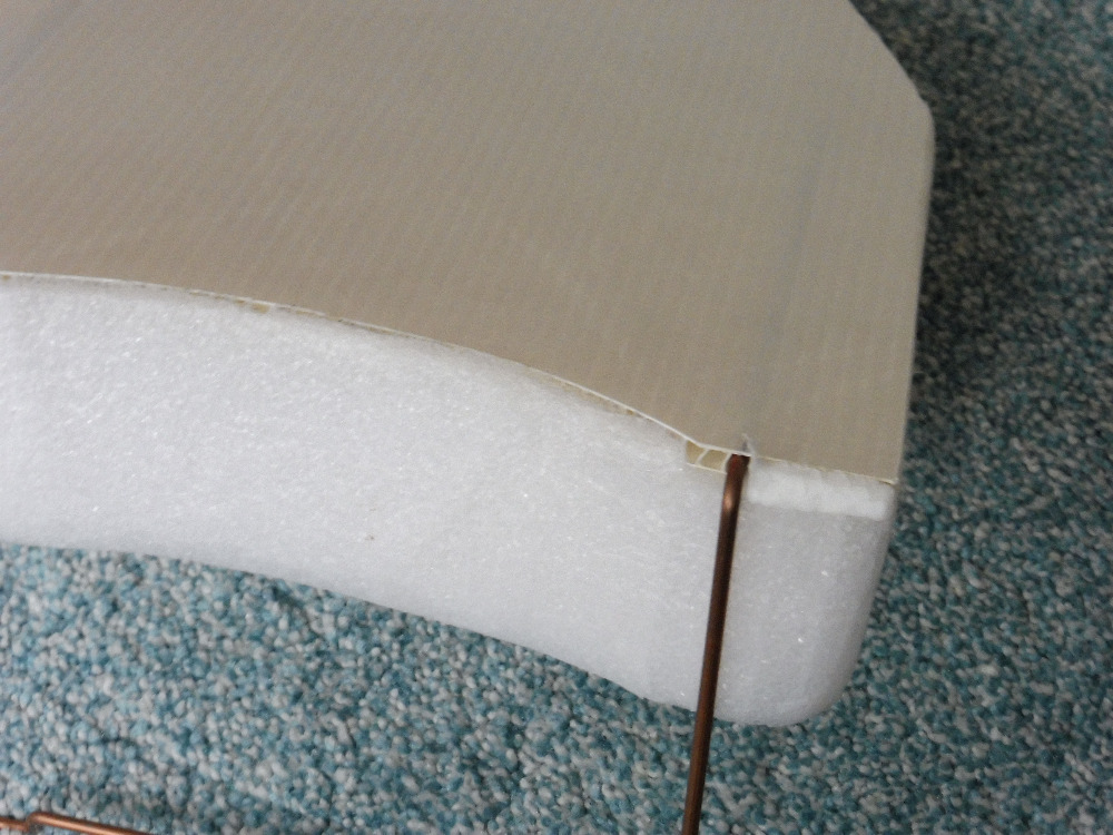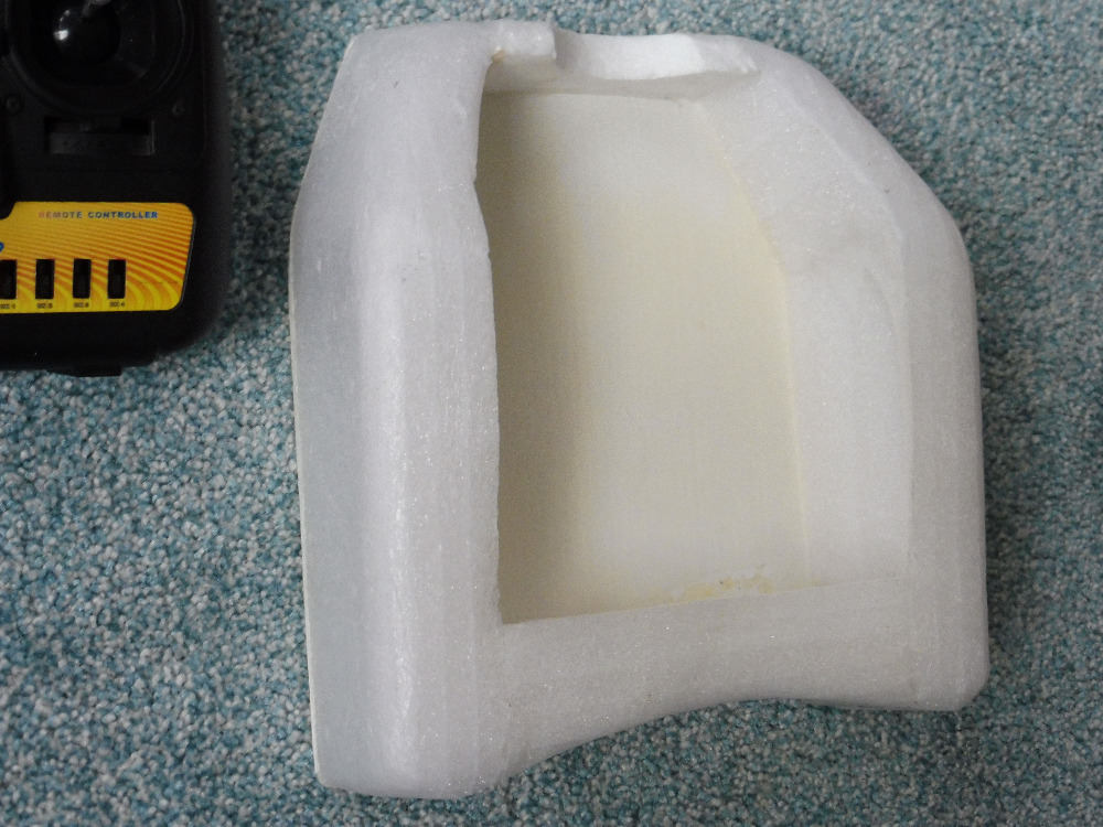 Začneme hlavními plochami, tedy kde budou ležet za provozu ruce. Následuje oříznutí na výšku zadní stěny zároveň s boky. Potom vyřízneme vybrání na břicho operátora – řez bude sledovat tvar vybrání v základní desce s přídavkem asi 5 až 6 mm. Potom ořízneme přední stěnu pultu. Výsledkem by měl být hranatý pult. Hrany nesrážíme. Dál bude potřeba žehlička a alobal. Žehličku používám obyčejnou (je nejlehčí), zakoupenou v krachujícím bazaru za 1 Kč avšak stále funkční, výkon cca 1250 W, firmy ETA, a nastavím „bavlna”. Nejdřív na odřezku polypropylenové pěny přes kousek alobalu zkusíme vytvořit zaoblení. Teplota má být taková, aby materiál pomalu uhýbal pod tlakem žehličky, ale ne samovolně pod žehličkou mizel. Teplotu je nutno nastavovat po kouskách, tepelná setrvačnost je značná, třeba i minuta a víc. Vždy část pultu nyní potáhneme mírným přitlačením alobalem a postupně, za neustálé kontroly dosaženého tvaru, přejížděním zaoblíme. Pozor, alobal sloupáváme až po zchladnutí tahem jakoby proti ještě přižehlenému, jinak se povede vytáhnout kusy povrchu a vlásky materiálu. Zaoblením je vlastní pult prakticky hotov, ještě s vyjmutým vysílačem slepíme vteřinovým lepidlem spoje boků a přední a zadní stěny pultu, s pomocí aktivátoru. Tavné lepidlo lze použít, ale s nižší teplotou (zase je nutná zkouška – většinou postačí vytlačit z chladnoucí pistole), jinak může dojít k poškození právě vytvořeného povrchu. Po vyžehlení pult trochu ztuhne a povrch se vyhladí.