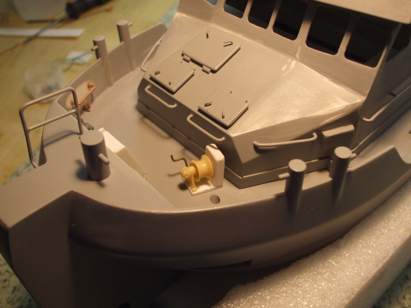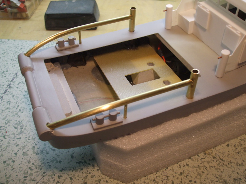V přídi na levé straně je vyfrézována, zabroušena a vlepena šachta na kotvu.