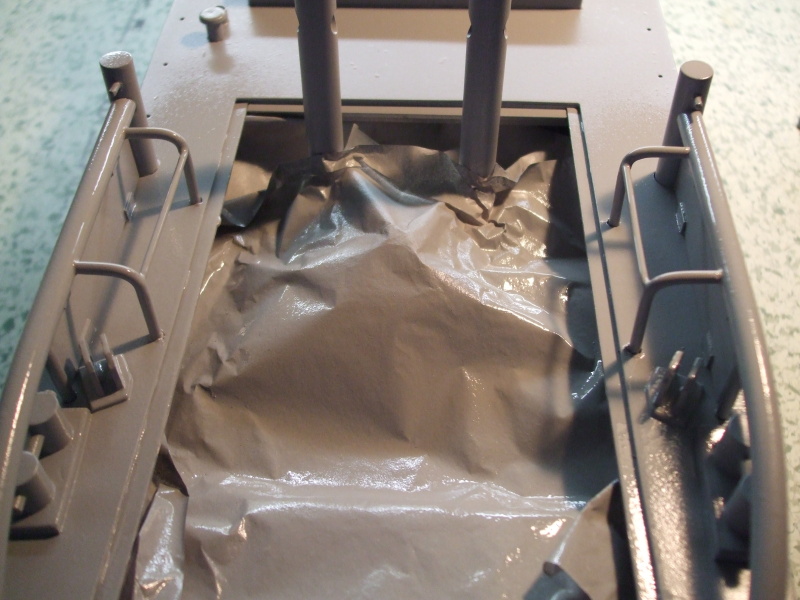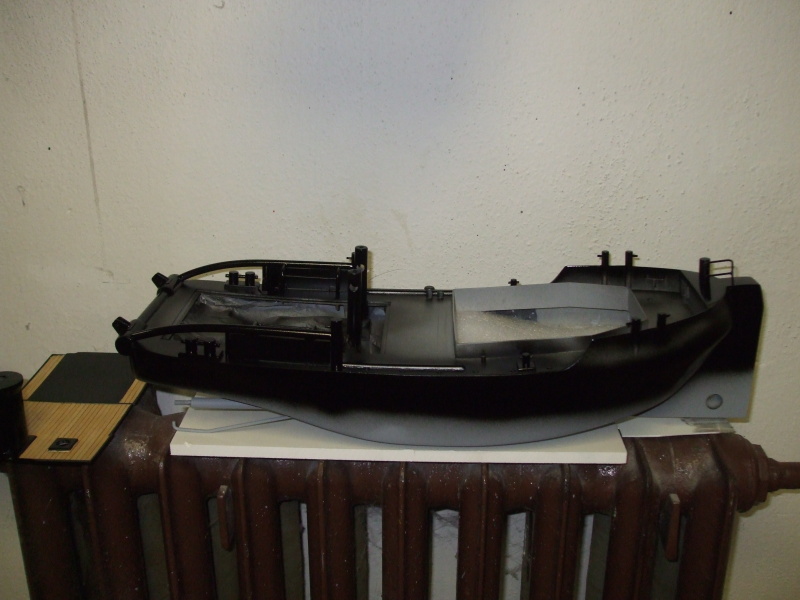 Typ barvy popsán v příspěvcích o stavbě Schnellboot S1xx. Po nastříkání uložen trup na vypálení na radiátor, který zapne, až se ochladí.