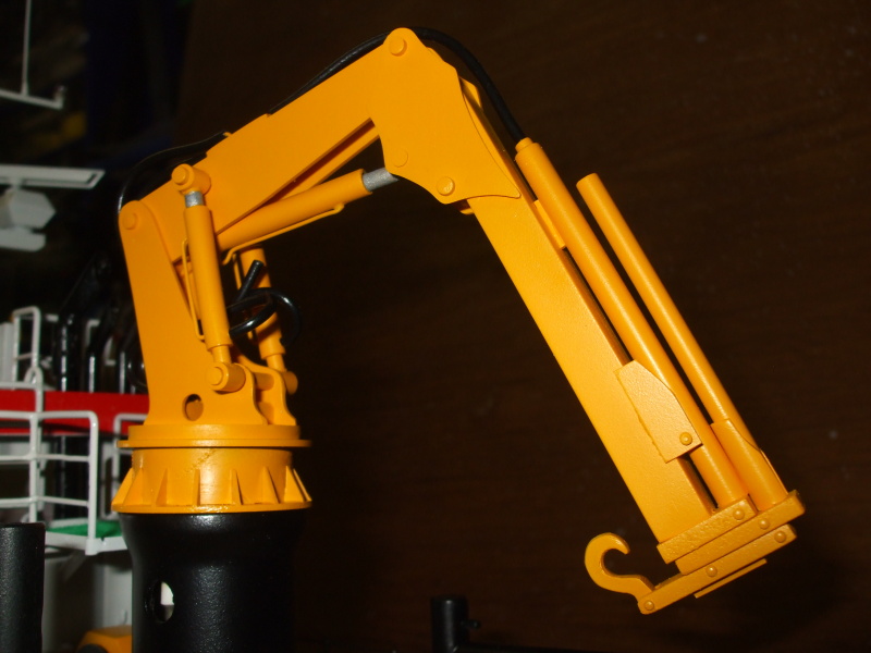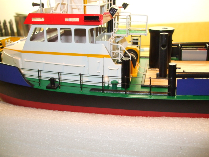 Na zadní palubě šedé bedny, přičemž jedna má červené víko stejně jako jeden poklop na přední části kabiny, abych řekl pravdu tak nevím proč ale na fotkách skutečné lodi to tak je.